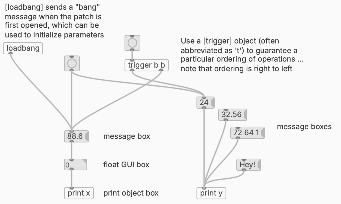 object sends out a “bang” message when the patch is first opened. It can be used to initialize patch parameters.