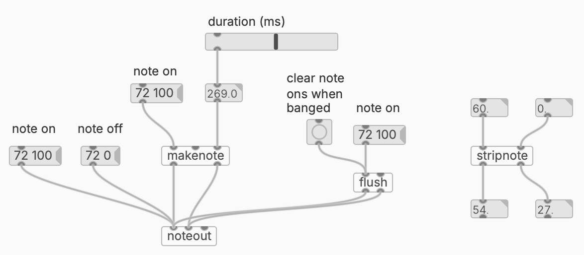 A stripnote object takes pitch and velocity messages and only passes values for velocity > 0.